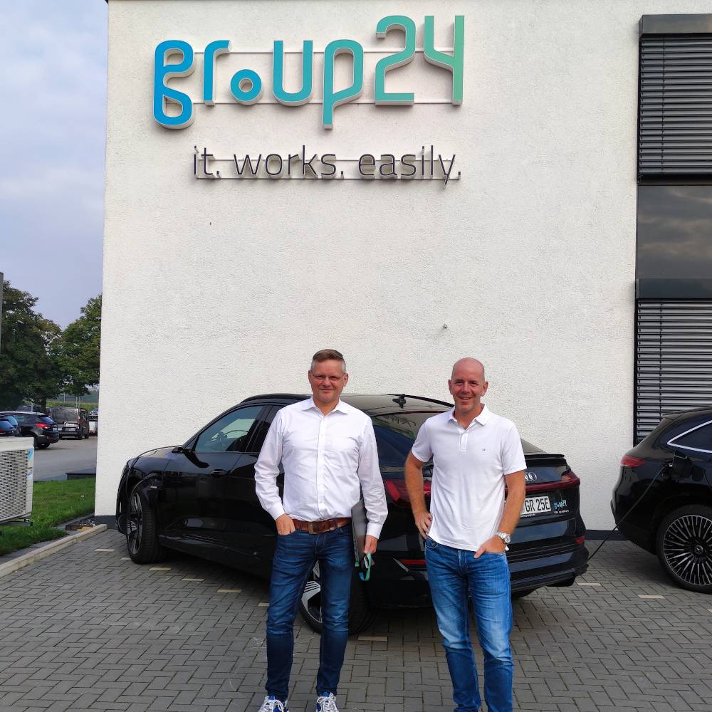 Die beiden Group 24-Geschäftsführer Christian Hornhues (l.) und Marc Eismann vor dem Firmensitz in Gescher.