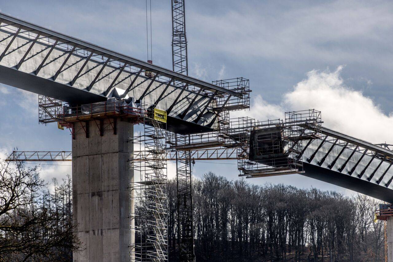 Wissing war ins Sauerland gekommen, um sich ein Bild vom Baustellenfortschritt zu machen: Seit mehreren Monaten wird der stählerne Überbau von beiden Seiten des Tales Stück für Stück über die Pfeiler geschoben. Nun sind beide Teile nur noch wenige Meter voneinander entfernt und sollen zeitnah miteinander verbunden werden, wie es am Dienstag von der Autobahn GmbH hieß. Der Brückenbauer spricht in so einem Fall von der "Stahlhochzeit".