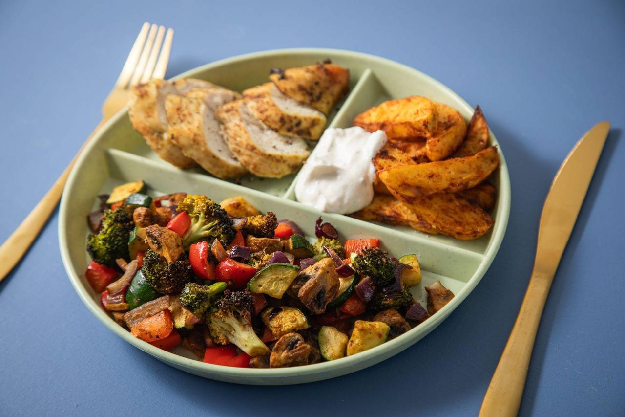 Hühnchenbrust, Kartoffelspalten, Kräuterquark und Röstgemüse