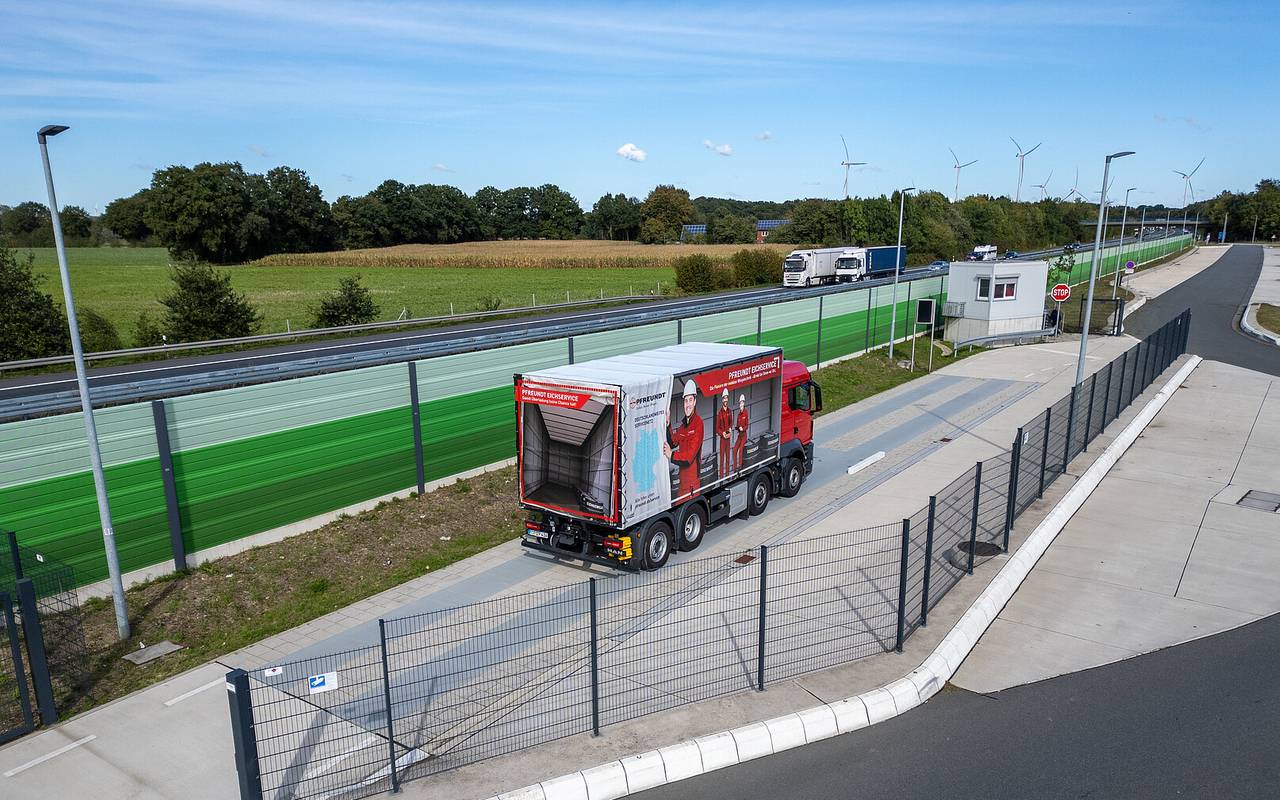 Am A31 Autobahnrastplatz in Hochmoor kommt nun erstmals in Deutschland eine LKW-Waage zum Einsatz, die die Achslasten genau messen kann. Sie stammt von dem Südlohner Unternehmen Pfreundt.