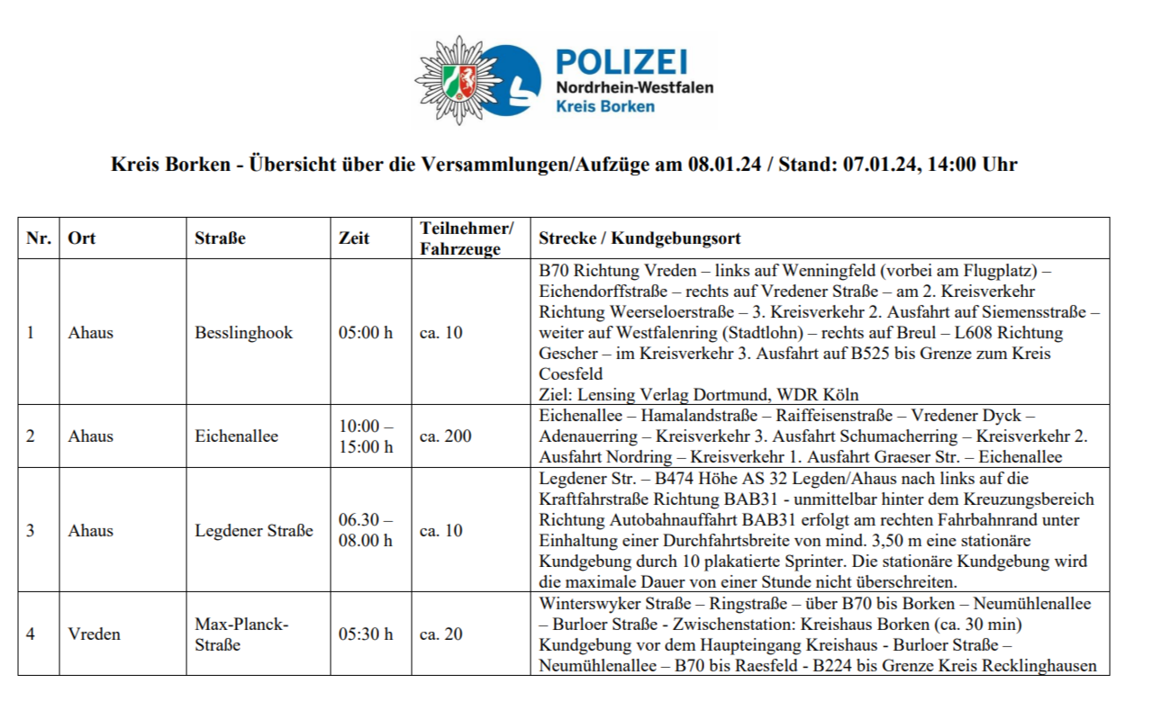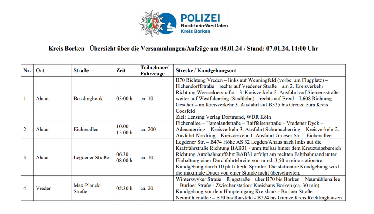 Die ersten Landwirte aus Ahaus, Vreden und Borken sind schon um 5.30 Uhr nach Dortmund und Köln losgefahren. In Ahaus, Bocholt, Rhede und Borken und Vreden waren damit insgesamt fast 600 Trecker unterwegs. Hier findet Ihr die Streckenübersicht: