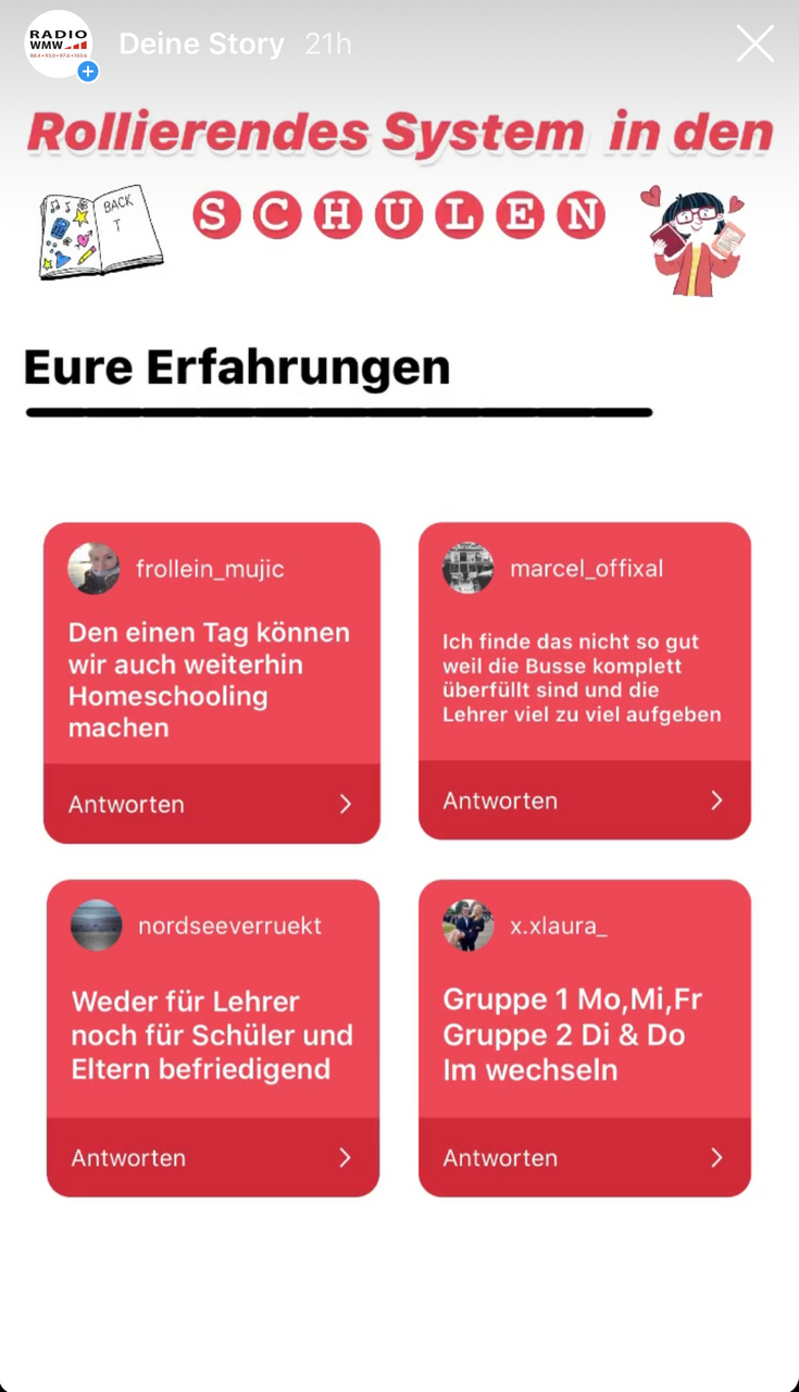 Unterricht gibt es wieder - aber halt auch irgendwie anders. Rollierendes System nennt sich das ganze. Die Schüler kommen abwechselnd zur Schule, damit die nicht so voll ist. Jede Schule organisiert das selbst - heißt also überall auch was anderes für die Schüler. Gar nicht so einfach da den Überblick zu behalten. Wir haben Euch nach Euren Erfahrungen gefragt.