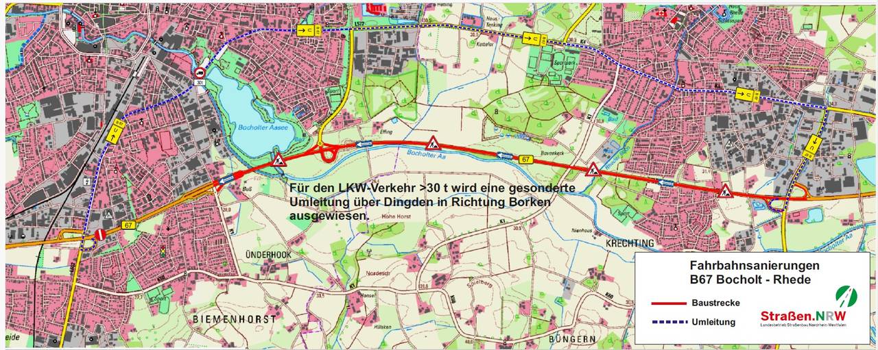 Ab 9 Uhr am Montag, 25.08.2025 ist die B67 zwischen Bocholt und Rhede gesperrt. Diese neue Großbaustelle trifft viele Pendler, die täglich auf der B67 zwischen Isselburg und Borken unterwegs sind. Die Bundesstraße ist in diesem Abschnitt schon etwas in die Jahre gekommen und muss saniert werden.
