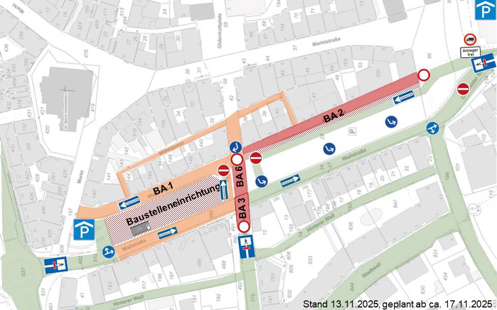 Die umfassenden Bauarbeiten zur Umgestaltung der Wallstraße in Ahaus kommen voran. Auf ihrer Website informiert die Stadt die Bürgerinnen und Bürger über den Zeitplan und die Fortschritte und ein Chatbot beantwortet Fragen z.B. zur Parksituation. Am Montag (24.11.2025) wird voraussichtlich die Kreuzung Wallstraße/Schloßstraße gesperrt und das bis Mitte Dezember. Es sind für diesen Zeitraum ringförmige Umfahrungen geplant, teilte die Ahauser Verwaltung mit.