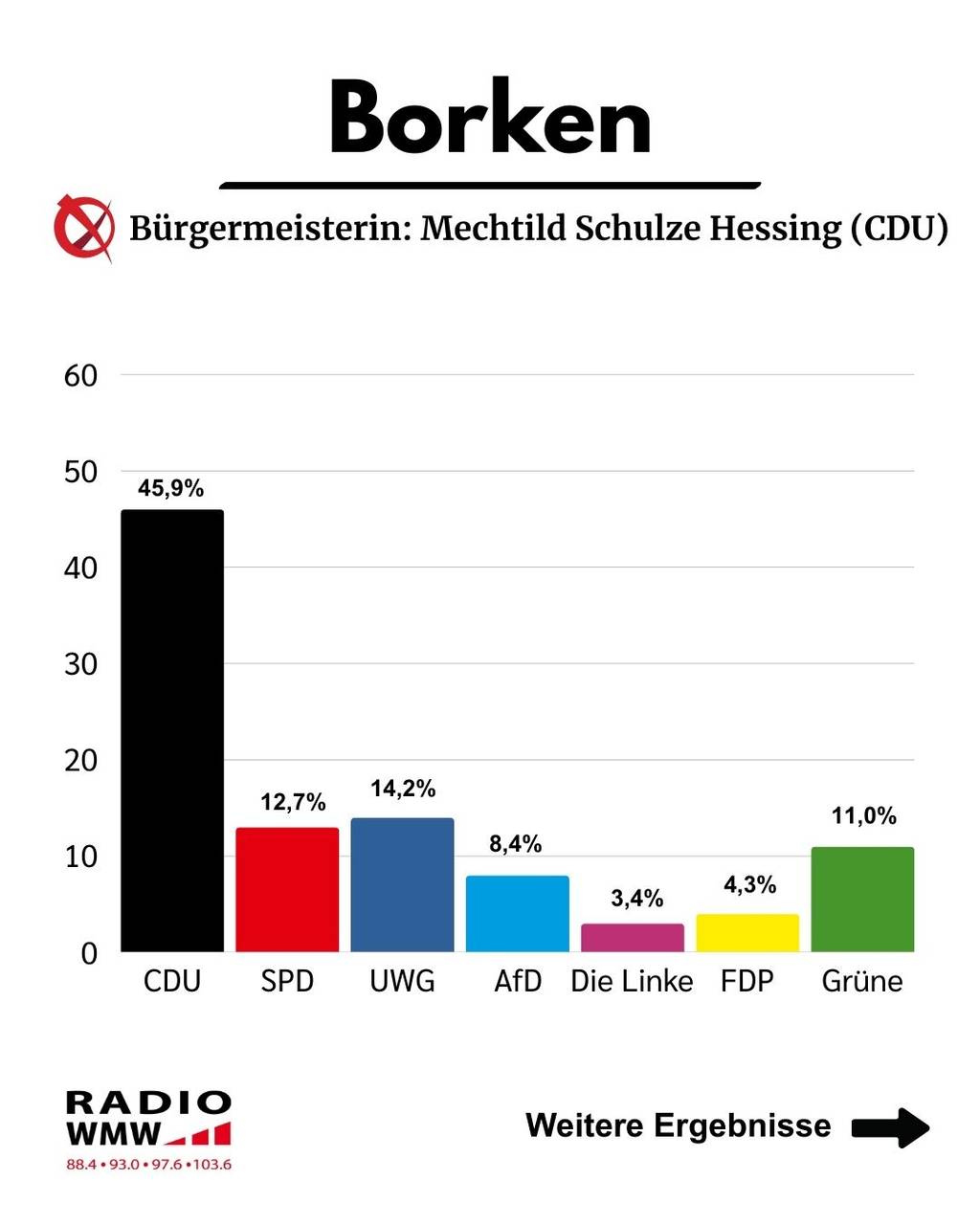 Mechtild Schulze Hessing (CDU) wurde mit 69,6 % der Stimmen erneut zur Bürgermeisterin von Borken gewählt.