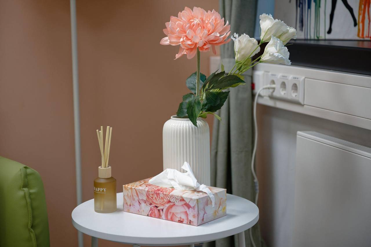 Neben dem Sofa steht eine Box mit Taschentüchern