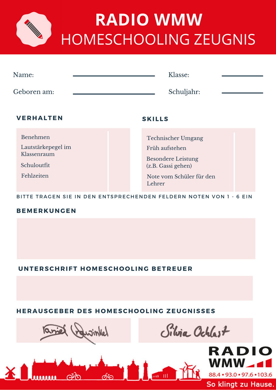 Wir finden: eigentlich müssten doch die wahren Lehrer die wahren Zeugnisse verteilen: Die Eltern! Und zwar das Homeschooling-Zeugnis für ihre Kids. Denn besondere Zeiten erfordern besondere Zeugnisse. Also ladet Euch einfach unser RADIO WMW Homeschooling Zeugnis herunter und füllt es für Eure Kids aus!