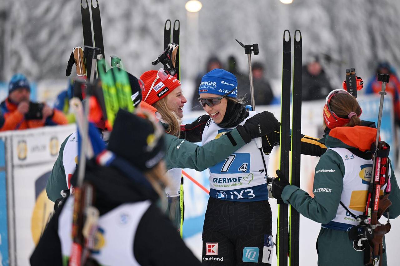 Weltcupgesamtsiegerin Preuß machte sich quasi zeitgleich mit Kirkeeide in den Schlussabschnitt. Und Deutschlands Sportlerin des Jahres überzeugte zunächst mit einem sehr schnellen Liegendschießen. Kirkeide holte den Rückstand von sieben Sekunden bis zum finalen Schießen aber auf und zog Preuß am Schießstand ab: Während die Norwegerin nur 20,6 Sekunden brauchte, dauerte es bei Preuß 50,3 Sekunden. Dennoch jubelte sie im Ziel mit ihren Teamkolleginnen.