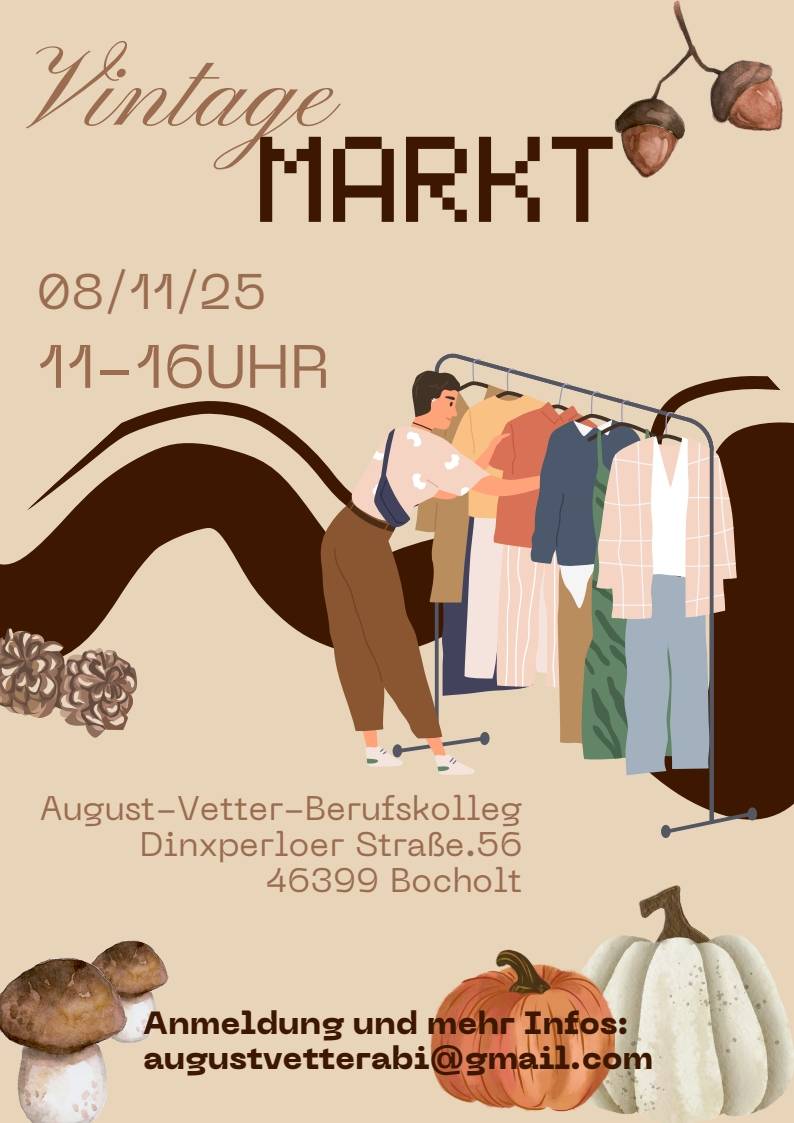 Das Augustvetter-Berufskolleg in Bocholt sucht Menschen die Ihre Kleidung loswerden wollen, um die Kleidung dann bei einem vintage Markt in Ihrer Aula zu verkaufen. Das ganze kostet 10 Euro Standgebühren. Mit den Spenden wollen Sie Ihren abiball am Ende Ihres schulwegs finanzieren. Jeder, der einen Stand beim vintage Markt haben möchte, kann sich gerne über die E-Mail-Adresse augustvetterabi@gmail.com melden. Das Event ist am 08.11.2025 von 11 bis 16. Uhr. Für mehr Infos Schaut auf dem Insta Account vom Abi Jahrgang vorbei.