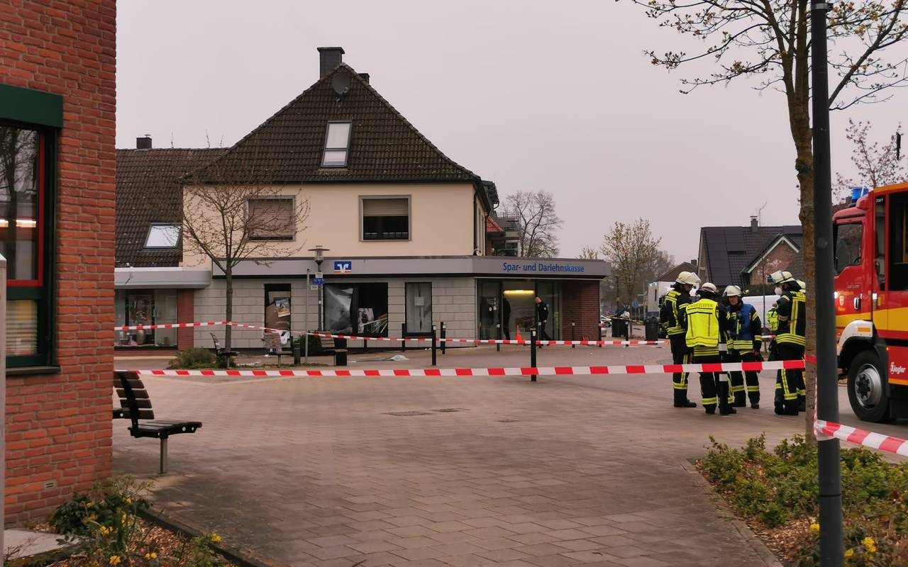 Nach der Sprengung eines Geldautomaten in Maria Veen auf der Poststraße ist der Tatort großflächig abgeriegelt. Noch kann die Polizei nicht ausschließen, dass sich weitere Sprengsätze versteckt vor Ort befinden. Die Einwohner über der stark beschädigten Volksbank dürfen noch nicht in ihre Wohnungen zurück. Der Kampfmittelräumdienst ist angefordert. Zeugen haben heute Morgen drei Personen beobachten können. Das Fluchtauto soll ein Golf gewesen sein - mit gestohlenen Weseler Kennzeichen. Verletzt wurde bei der Sprengung zum Glück niemand, obwohl die Sprengwucht laut Polizei sehr groß war. Sogar die Schulkinder in Maria Veen wurden heute Morgen auf ihrem Weg umgeleitet, damit sie sicher zum Unterricht kommen konnten. Der Unterricht dort läuft aber jetzt ganz normal.