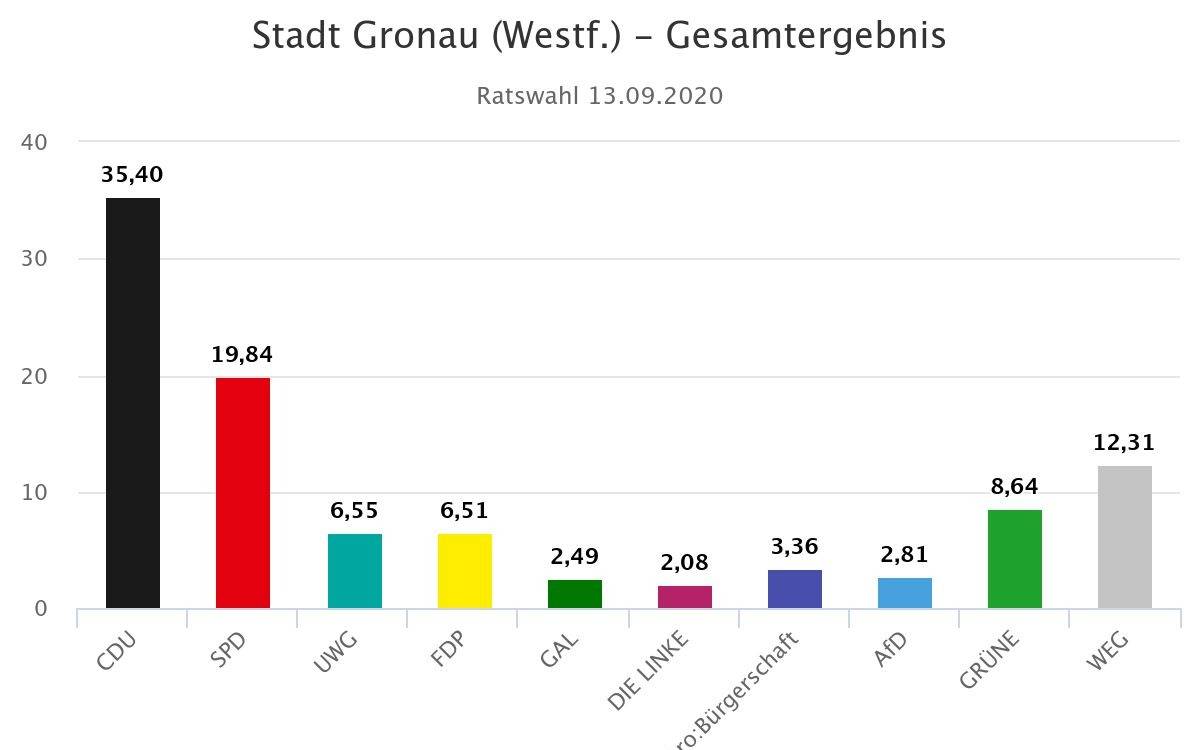 Gronau hat gewählt! In der Stadt sind laut Verwaltung aktuell rund 39.500 Menschen wahlberechtigt. Davon haben bei der Kommunalwahl 2025 44,77 % der Wählerinnen und Wähler Ihr Stimmrecht wahrgenommen. Bei der letzten Kommunalwahl 2020 gab es eine Wahlbeteiligung von 39,84%.