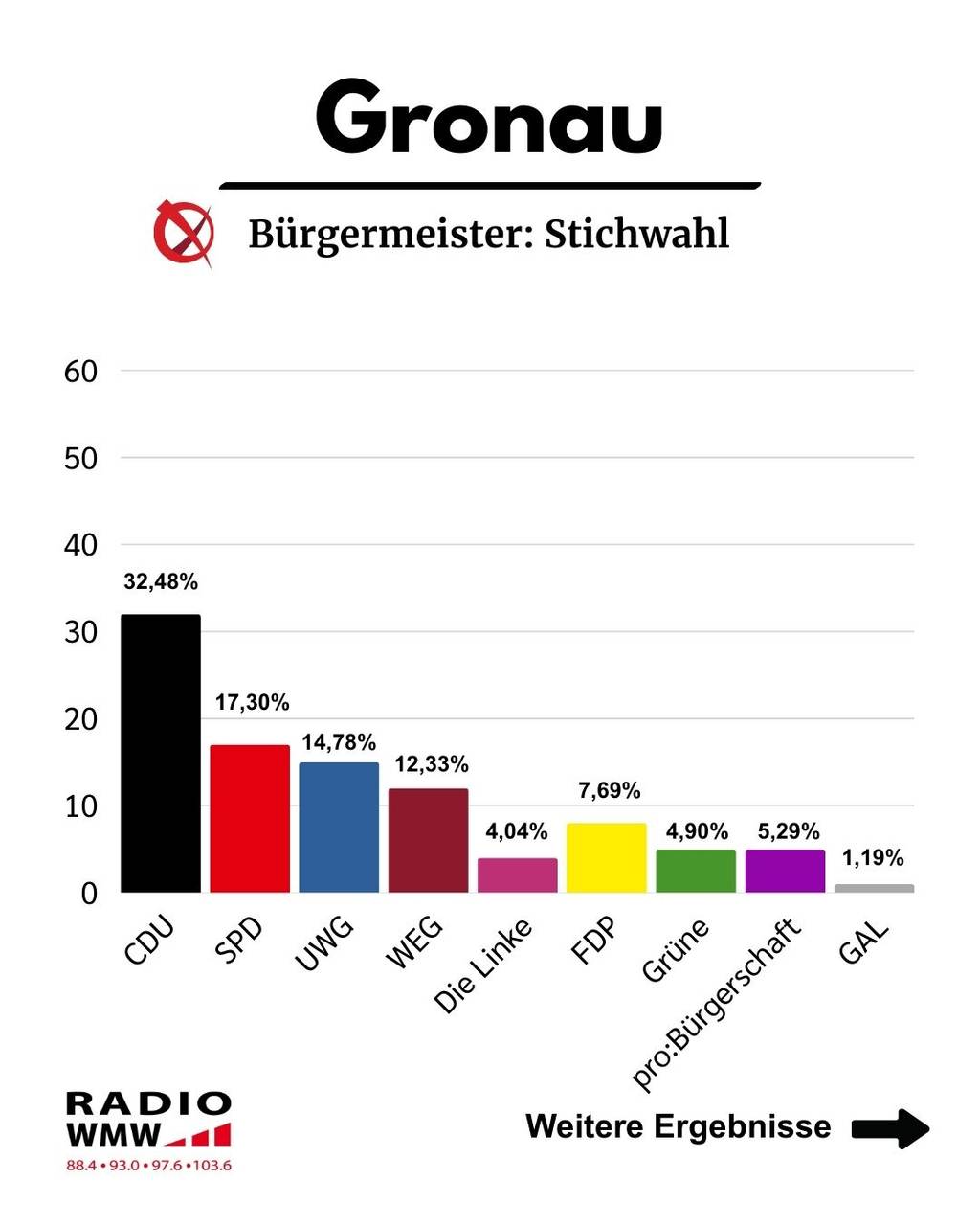 In Gronau führt Rainer Doetkotte (CDU) mit 35,69 % bei der Bürgermeisterwahl, verfehlt aber die absolute Mehrheit – es kommt zur Stichwahl.