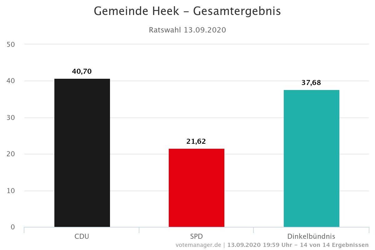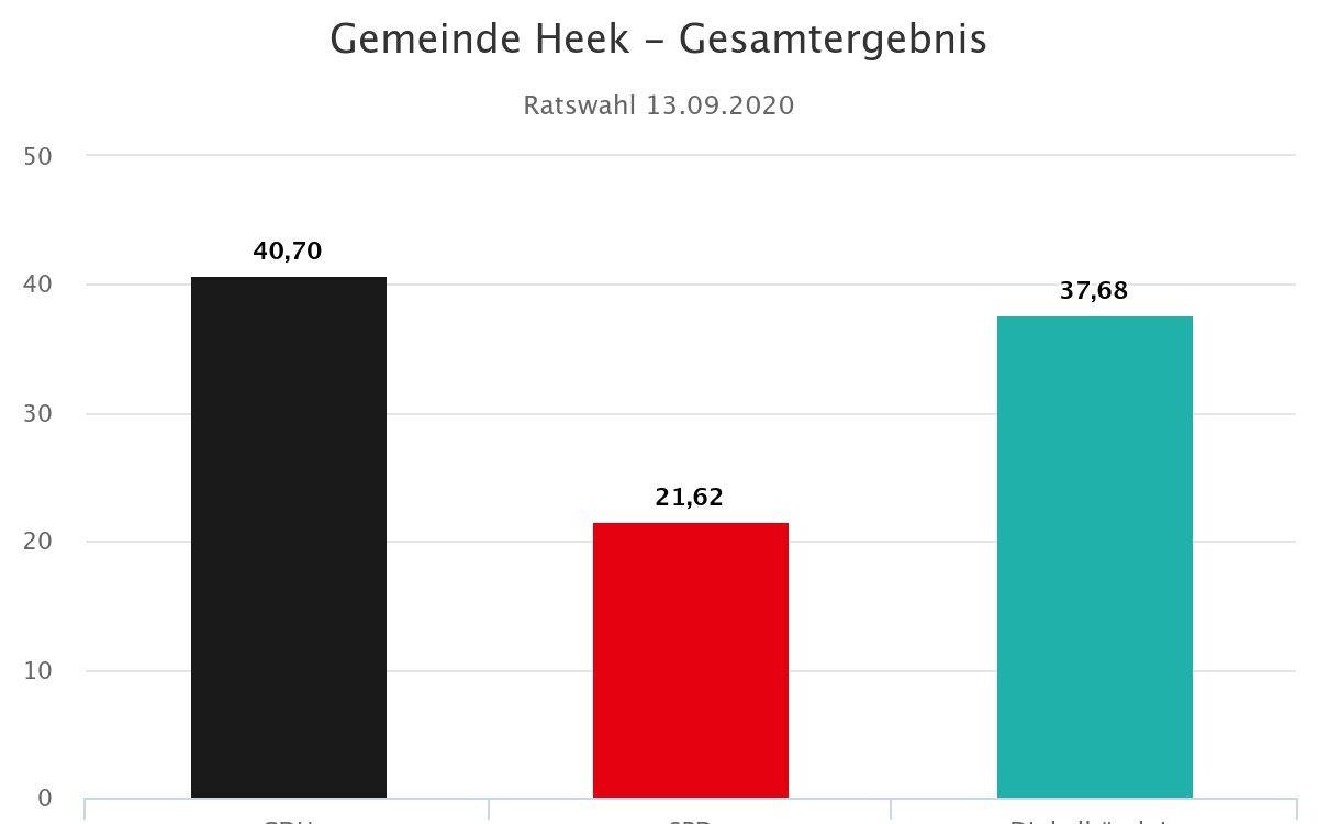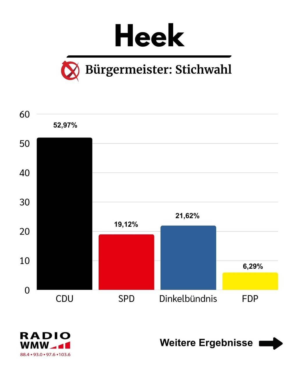 In Heek gibt es heute keine klare Entscheidung: Jürgen Lammers (parteilos) liegt mit 45,41 % vorn, verfehlt aber die absolute Mehrheit. Es kommt zur Stichwahl.