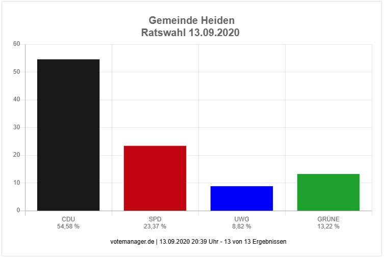 Heiden hat gewählt! In der Gemeinde sind laut Verwaltung aktuell rund 7.000 Menschen wahlberechtigt. Davon haben bei der Kommunalwahl 2025 68,16 % der Wählerinnen und Wähler Ihr Stimmrecht wahrgenommen. Bei der letzten Kommunalwahl 2020 gab es eine Wahlbeteiligung von 69,43%.