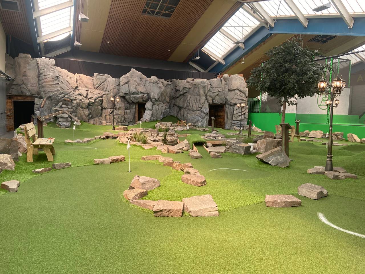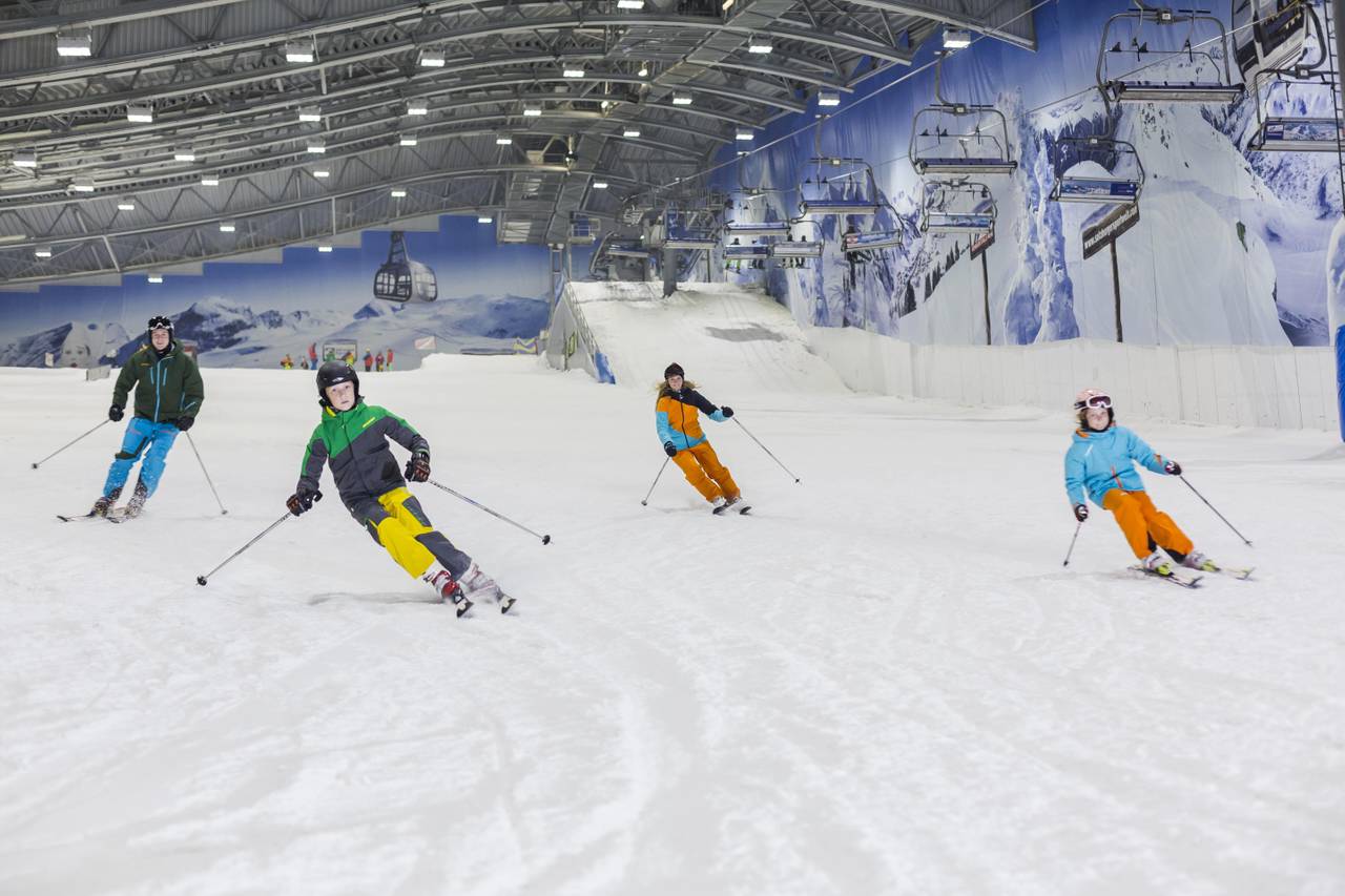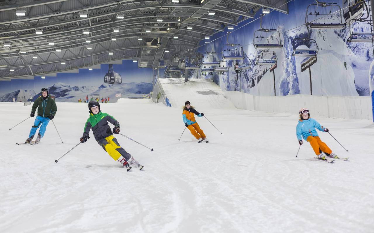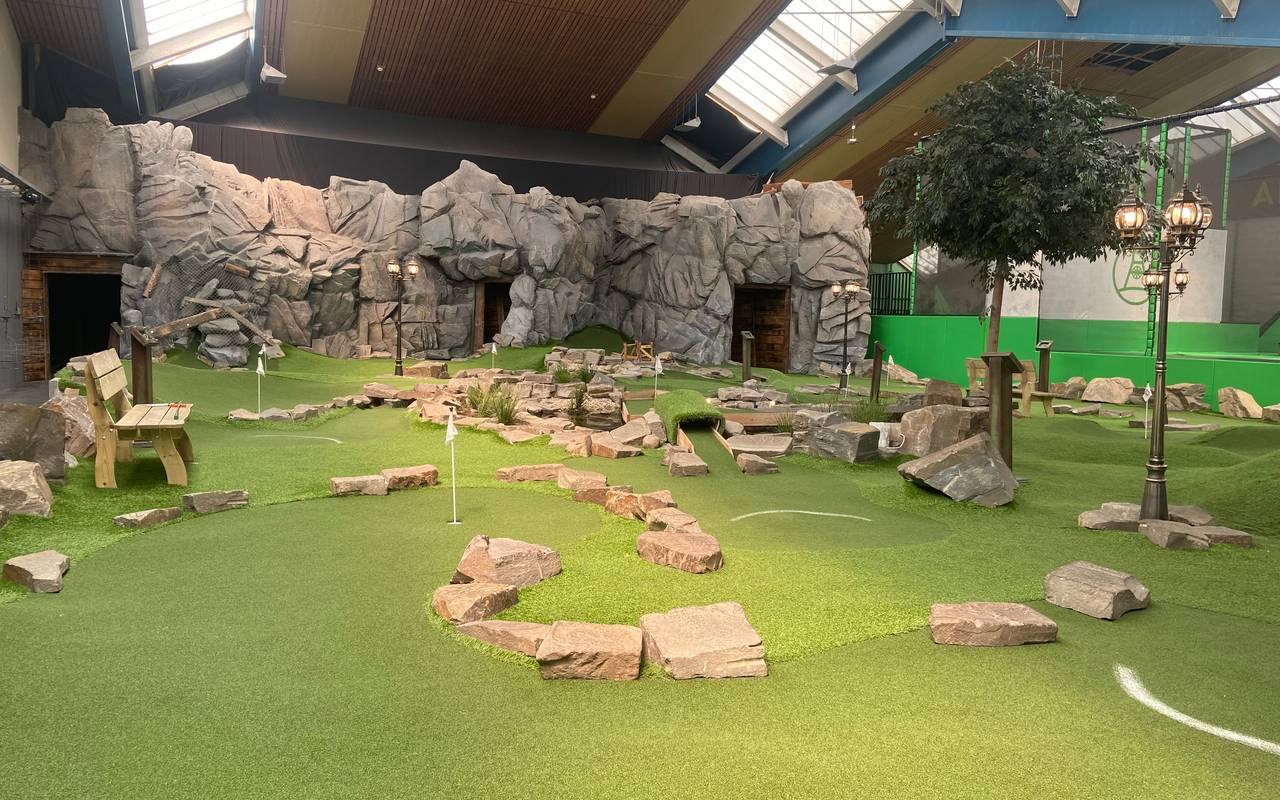 Alpenpark Neuss - In der Ski-Halle kann man auf einer Strecke von 300 Metern Rodeln, Snowboarden oder klassisch Ski-Fahren. Um die Skihalle herum gibt es einen Kletterpark und eine lange Seilrutsche. Zusätzlich kann man zwischen großen Milchkannen angelegten Bachläufen und Gipfelkreuzen Minigolf oder eine Art Fußball-Golf spielen. Dabei muss der Ball mit möglichst wenig Schüssen in ein Tor.