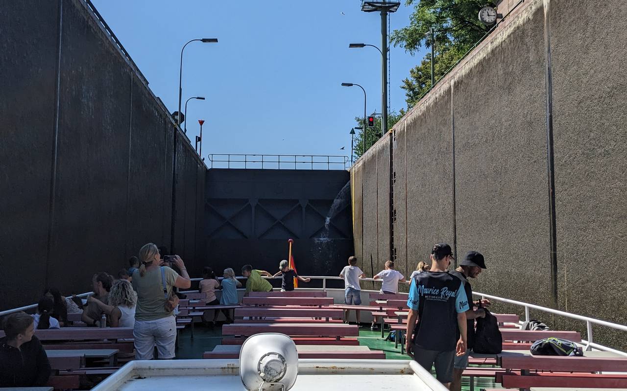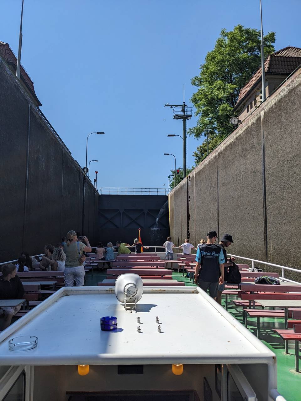 Schachtschleuse Minden - Die von 1911 bis 1915 gebaute Schachtschleuse in Minden liegt im Abstieg vom Mittellandkanal zur Weser. Ihr Standort wurde unmittelbar westlich der Kanalbrücke unterhalb der letztlich in den Bau einbezogenen natürlichen Flussterrasse gewählt, um ein direktes Wechseln der Schiffe zwischen Kanal und Weser zu ermöglichen. Die Schachtschleuse wurde mit der ausgereiften und ästhetisch aufbereiteten Technik bis heute zum Mittelpunkt touristischen Interesses.