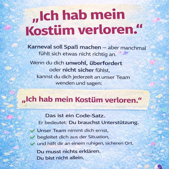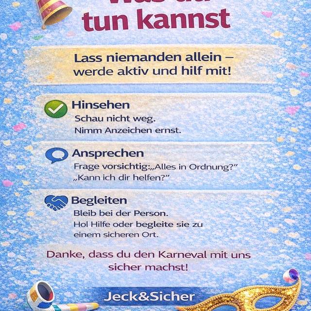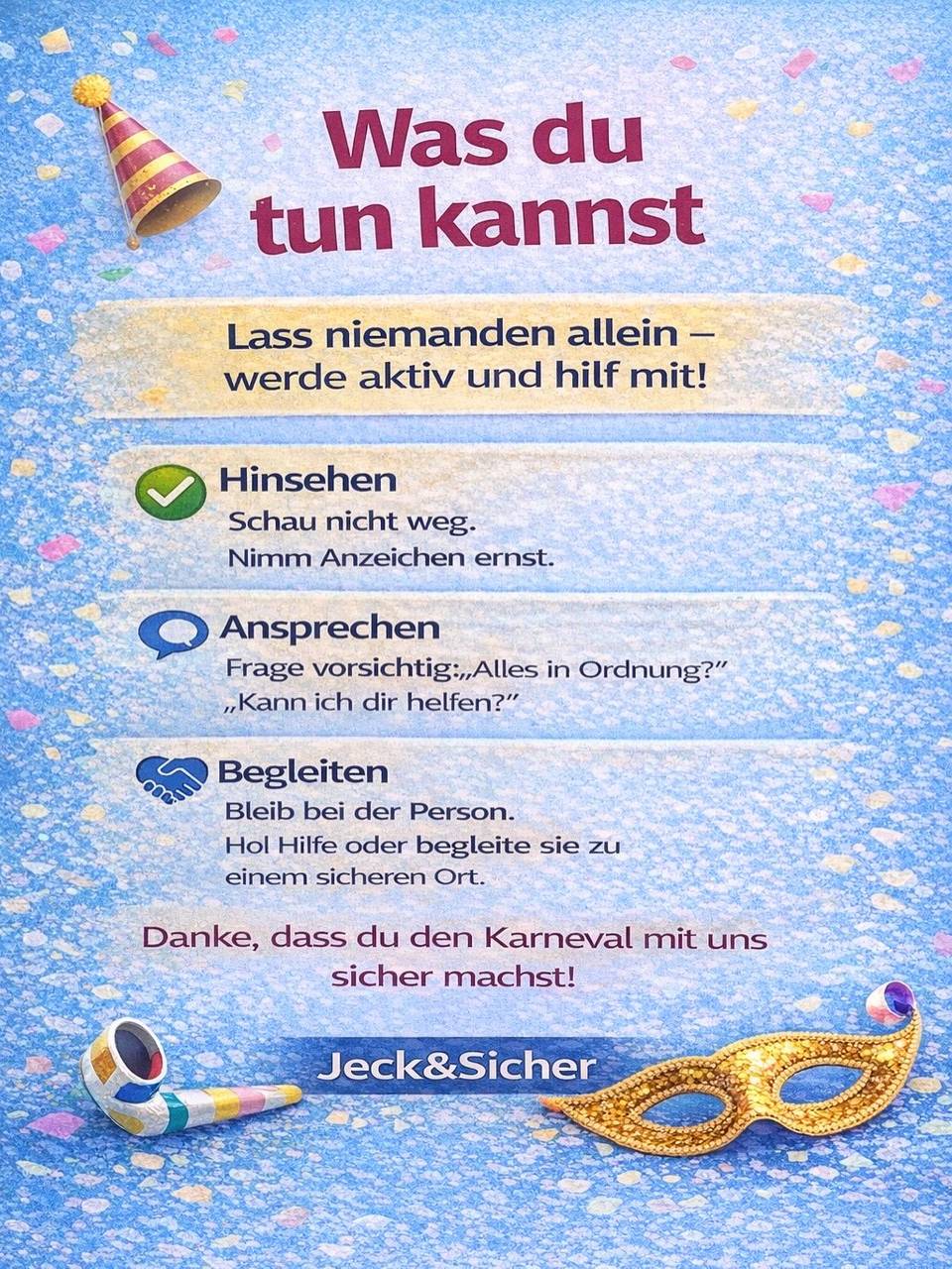 Gerade im Karneval, wenn alle ausgelassen feiern, wollen wir uns sicher fühlen. Es kann Situationen geben, in denen vor allem Frauen und Mädchen sich belästigt, bedroht oder einfach nur unsicher fühlen.