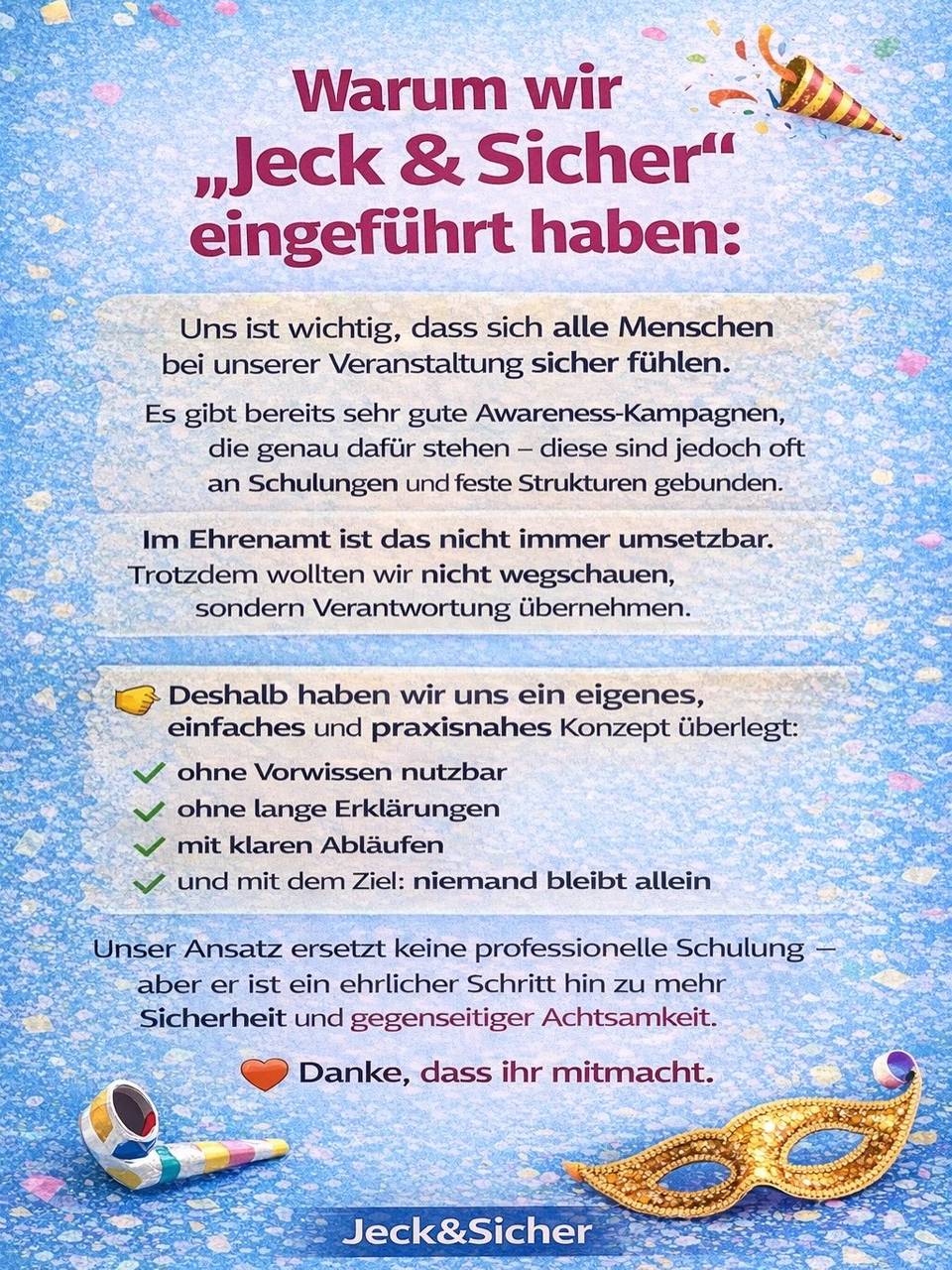 Die Idee für "Jeck & Sicher ist nicht neu". Sie ist in Anlehnung an das Kneipen-Awareness-Konzept "Luise" entstanden. Eben übertragen auf Vereine mit ehrenamtlichen Mitgliedern. Dabei beachten sie drei Kernsätze: