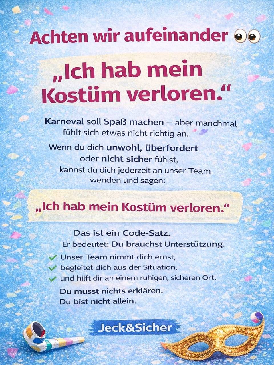 Und genau da setzt eine Aktion an, die die 1.Bocholter Karnevalsgesellschaft BOKAGE jetzt erfolgreich bei ihrer Galasitzung angewendet hat. Unter dem Motto: "Jeck & Sicher" hat die BOKAGE ein Konzept entwickelt, dass den Karneval sicherer macht, aber durchaus auch bei anderen Gelegenheiten wie Schützenfest, Party etc. Anwendung finden könnte. Die BOKAGE hat ihr Team bei Veranstaltungen wie der Gala-Sitzung oder der Altweiberparty sensibilisiert: Wenn sich jemand mit dem Code-Satz: "Ich hab mein Kostüm verloren" an sie wendet, kümmern sie sich sofort darum, die Person in Sicherheit (in einen sicheren Raum) zu bringen. Dort wird gemeinsam geklärt, wie es weitergeht (nach Hause bringen, Polizei einschalten etc.) Die Personen, die helfen, sind mit einem Aufkleber mit der Aufschrift "Jeck & Sicher" am Ornat oder an der Kleidung gut zu erkennen.
