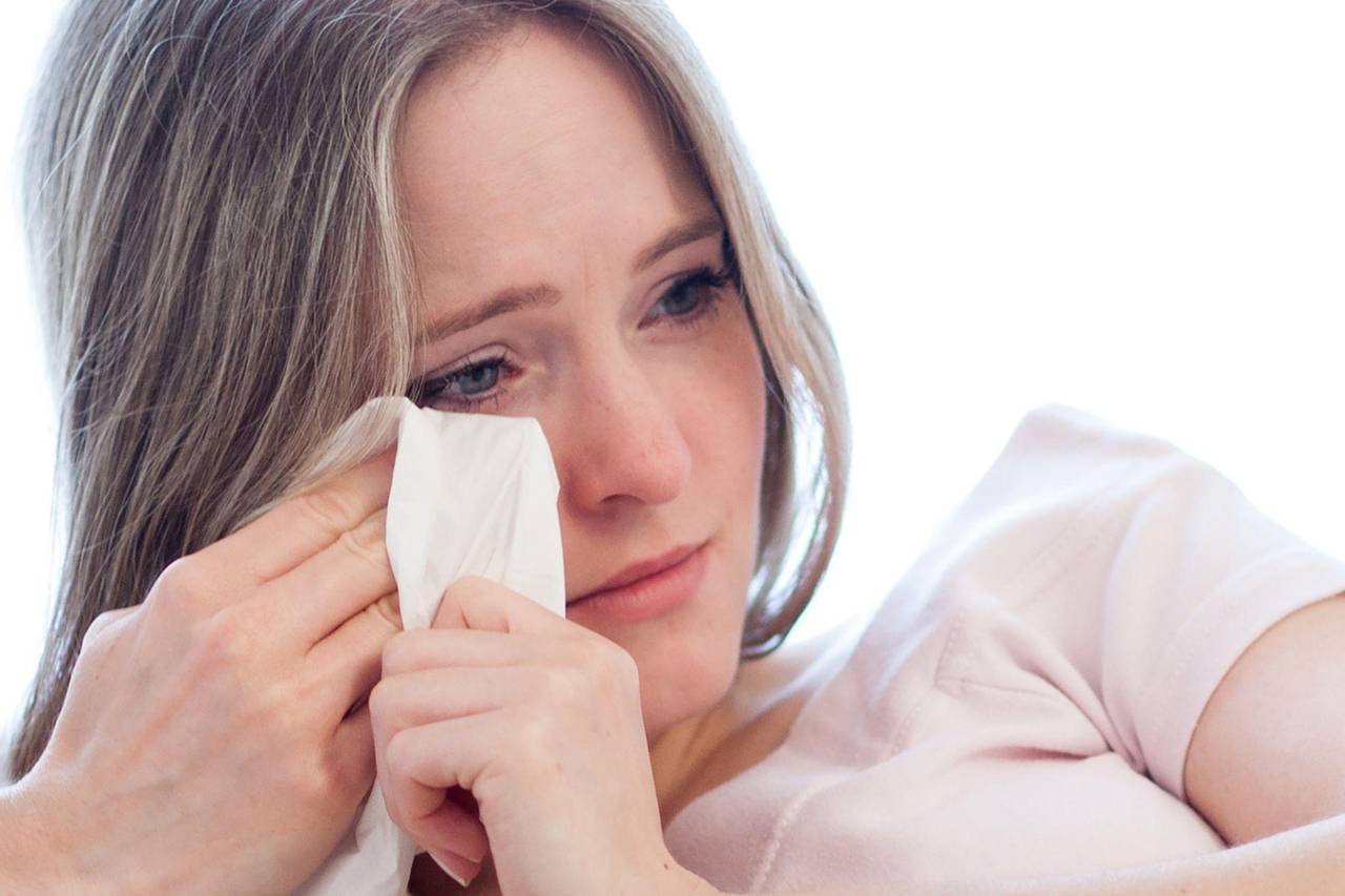 Frau wischt sich mit einem Taschentuch die Tränen aus den Augen