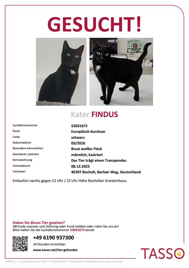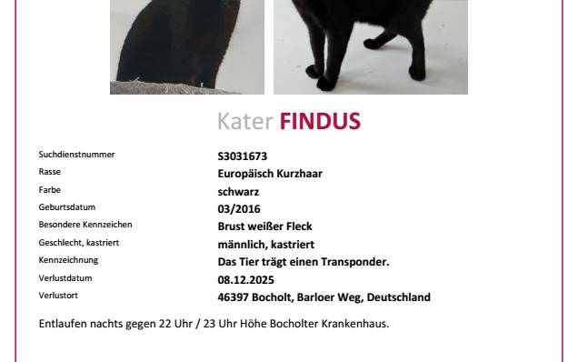 In Bocholt ist Kater Findus entlaufen! Er wurde zuletzt am 8. Dezember 2025 in der Nähe des Krankenhauses in Stenern gesehen.