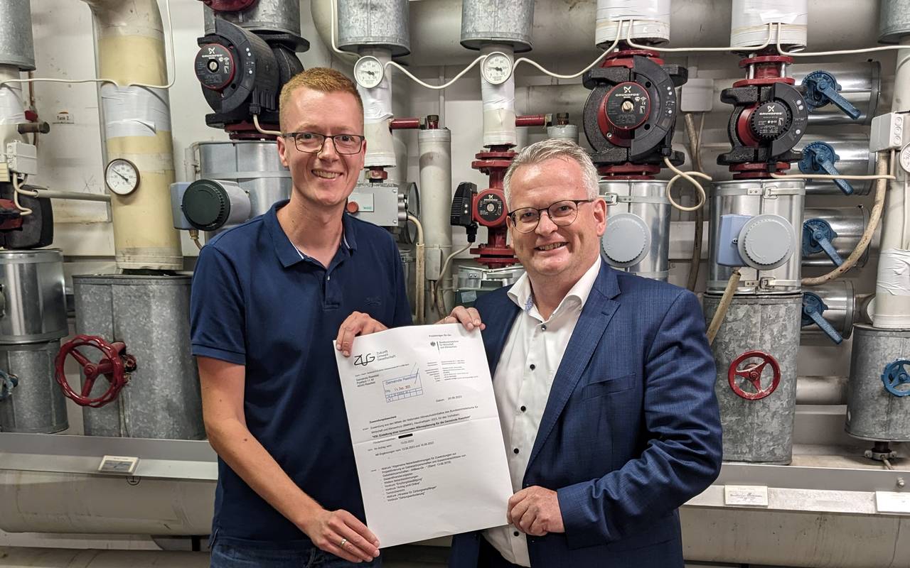 Nun hat die Gemeinde vom Bundeswirtschaftsministerium einen Förderbescheid erhalten. Das Gebäudeenergiegesetz soll im November den Bundesrat passieren. Doch es gibt Kommunen, die gar nicht darauf warten und schon frühzeitig aktiv geworden sind - wie Raesfeld. Die Gemeinde hatte schon frühzeitig die Durchführung der Kommunalen Wärmeplanung für das Gemeindegebiet einstimmig beschlossen. Und dann im März einen Antrag gestellt, um vom Bund Fördermittel dafür zu bekommen. Jetzt hat Raesfeld Post vom Bundeswirtschaftsministerium erhalten: Ein Förderbescheid über rund 104.000 Euro. Das sind 90 % der damit verbunden Kosten in Höhe von rund 114.000 Euro, freut sich Bürgermeister Martin Tesing (im Bild rechts). Die Raesfelder Wärmeplanung wird künftig Dreh- und Angelpunkt für die Bestandsbauten sein.