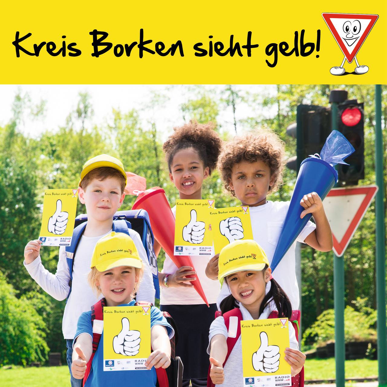 Hier bei uns im Kreis Borken geht es für viele Kinder nach den Sommerferien zum ersten Mal zur Schule. Da wollen wir von RADIO WMW dafür sorgen, dass die Kleinen sicher zur Schule und zurück kommen. Im Rahmen unserer Aktion "Kreis Borken sieht gelb!" verteilen wir leuchtend gelbe Käppis an alle I-dötzchen und Dank - sowie Denkzettel an die Autofahrer an den Schulen.