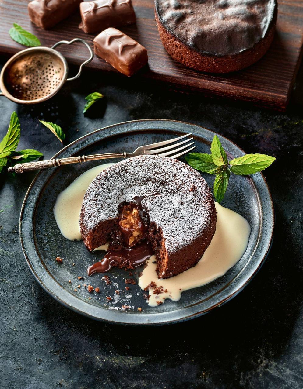Dann je einen kleinen Schoko-Nuss-Riegel in die Mitte stecken, die Gefäße auf die heiße Röstplatte setzen und 5 bis 8 Minuten bei 230 Grad backen. Herausnehmen, mit Puderzucker bestreuen und abkühlen lassen. «Der Kuchen lässt sich schwer aus der Form lösen, daher am besten darin servieren», sagt Christian Henze. Dazu passt Eis oder eine leckere Soße.