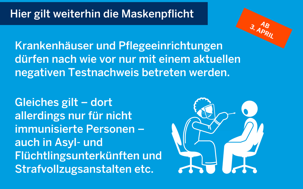 In Arztpraxen, Krankenhäusern und Pflegeheimen müssen wir also erstmal weiter eine Maske tragen. Das gilt auch für den ÖPNV, wenn wir Taxi fahren sowie für bestimmte staatliche Einrichtungen. Krankenhäuser und Pflegeeinrichtungen dürfen außerdem weiterhin von Besuchern einen aktuellen negativen Testnachweis verlangen.
