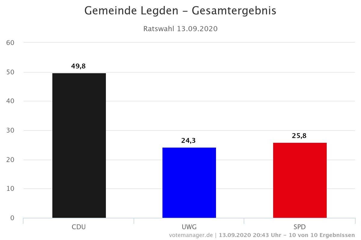 Legden hat gewählt! In der Gemeinde sind laut Verwaltung aktuell rund 5.900 Menschen wahlberechtigt. Davon haben bei der Kommunalwahl 2025 68,09 % Wählerinnen und Wähler Ihr Stimmrecht wahrgenommen. Bei der letzten Kommunalwahl 2020 gab es eine Wahlbeteiligung von 68,7%.