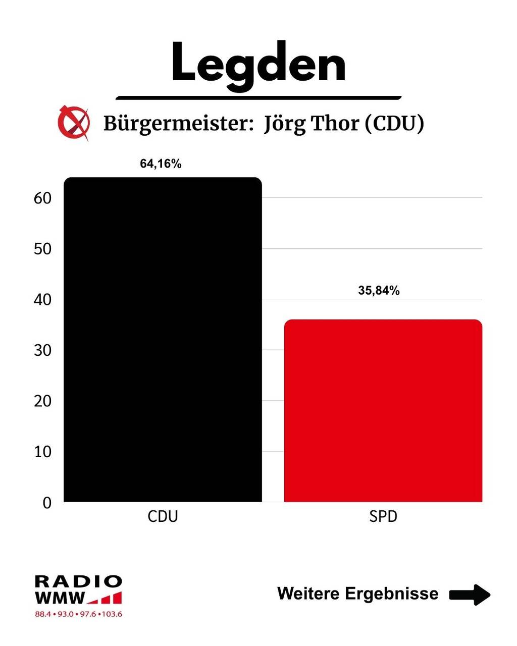 Jörg Thor (CDU) hat die Bürgermeisterwahl in Legden gewonnen. Mit knapp 59 Prozent setzte er sich gegen Dieter Berkemeier (unabhängig) durch.