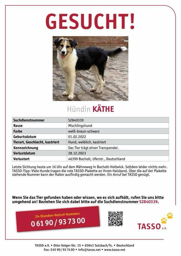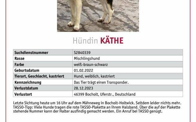 Seit Donnerstag (28.11.2023) wird die Mischlingshündin Käthe aus Rhede vermisst. Entlaufen ist sie in Lowick. Zuletzt gesichtet wurde sie gegen 16.00 Uhr auf dem Mähneweg in Bocholt Holtwick. Käthe ist eine Angsthündin aus Griechenland und ist erst seit 6 Monaten bei ihren neuen Besitzern. Falls Ihr Käthe gesehen habt, informiert bitte den Tiernotruf Bocholt (Tel.: 02871 9911188).