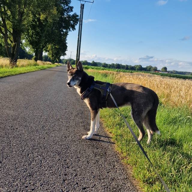Seine Besitzer kommen aus Datteln und waren in Epe zu Besuch und seitdem irrt er umher. Sein Name lautet Mailo.