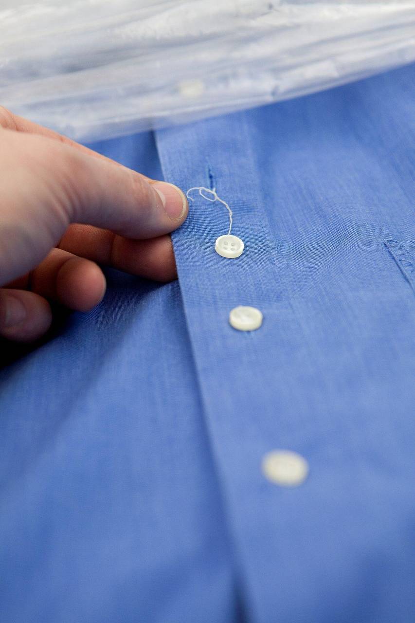 Bei einem Hemd hat sich am Knopf ein Faden gelöst