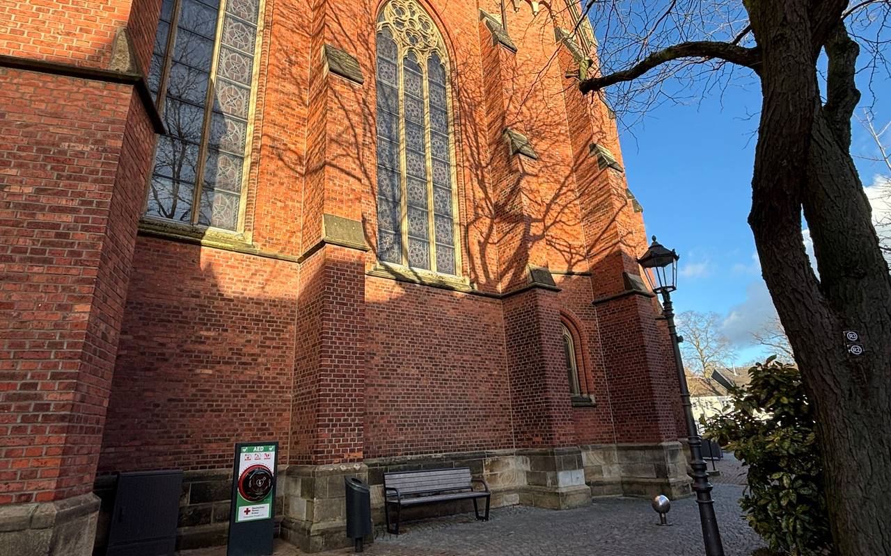 Um bei einem Herz-Kreislauf-Stillstand schnell helfen zu können, hängen bei uns im Westmünsterland schon viele öffentlich zugängliche Defibrillatoren. Allein in Rhede sind es 21. Zuletzt wurde einer an der St. Gudula-Kirche angebracht.