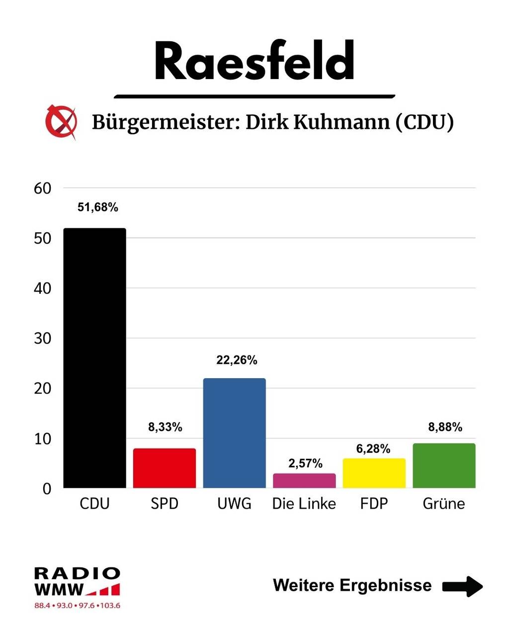 Raesfeld hat einen neuen Bürgermeister. Dirk Kuhmann von der CDU ist mit 56.4 Prozent der Stimmen gewählt worden.