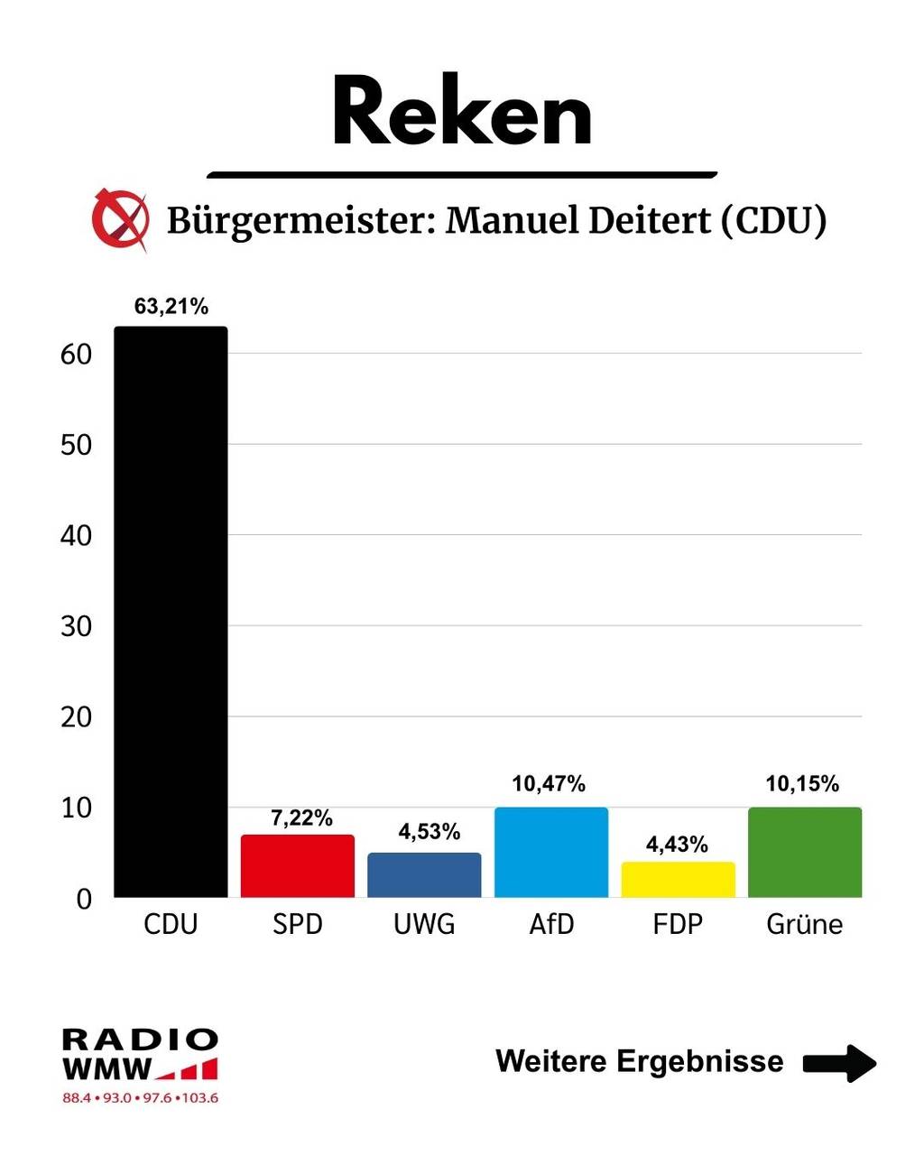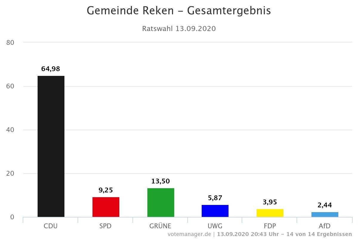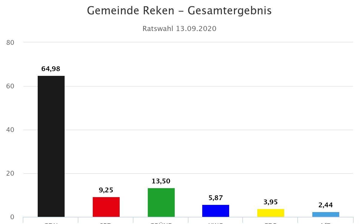 Reken hat gewählt! In der Gemeinde sind aktuell laut Verwaltung etwa 12.500 Menschen wahlberechtigt. Davon haben bei der Kommunalwahl 2025 68,88 % der Wählerinnen und Wähler Ihr Stimmrecht wahrgenommen. Bei der letzten Kommunalwahl 2020 gab es eine Wahlbeteiligung von 64,20%.