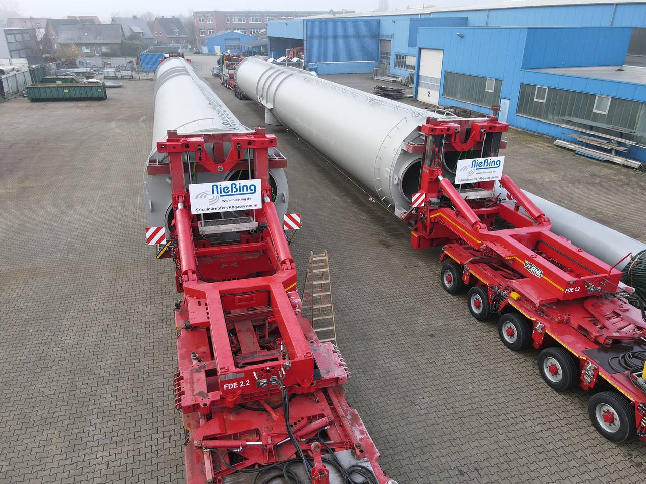 Heute Nacht (Donnerstag, 10.12.) startet bei der Firma Nießing in Borken der letzte große Schwertransport. Bevor das Unternehmen nach Raesfeld umzieht, werden heute Abend noch zwei Stahlschornsteine per Schwertransport zu ihrem Zielort in Saarbrücken abtransportiert. Der Transport selbst ist sehr aufwändig, die LKW sind mit Ladung 65 Meter lang und zusammen 123 Tonnen schwer. Damit dauert die Fahrt deutlich länger, sagt Andreas Grabermann von Nießing: