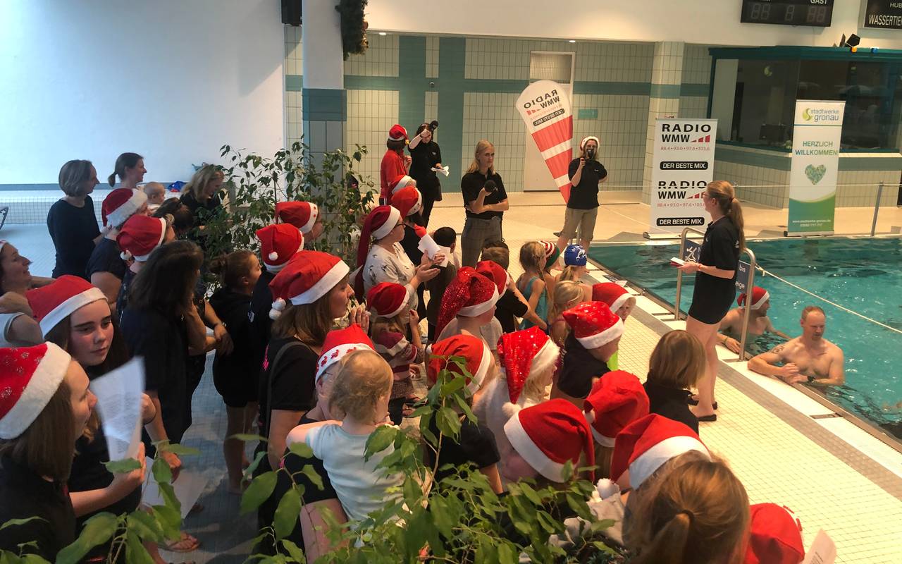 Unser Morningshowteam hat gewettet, dass der Schwimmverein Epe es NICHT schafft, um 15 Uhr aus mindestens 30 Menschen einen schwimmenden Tannenbaum ins Becken zu formen UND zusätzlich einen weihnachtlichen Chor zu stellen, der „Oh Tannenbaum!“ singt.
