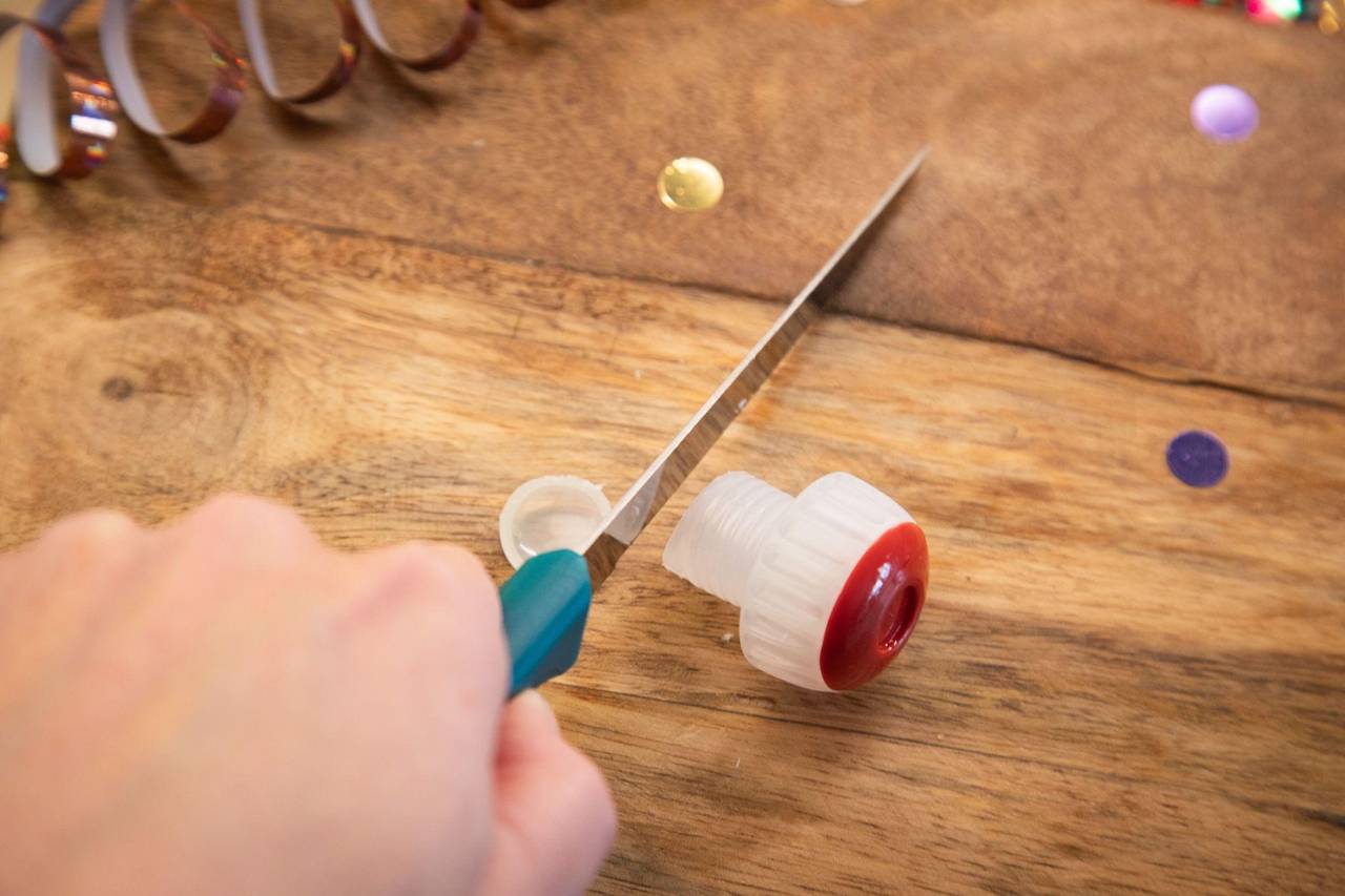 Und so geht's: Mit einem scharfen Messer den Boden vom Kunststoffkorken abschneiden und die Kappe vom Korken lösen. Den Korken wieder in die Flasche stecken - er dient jetzt als Ausschenker. Die Kappe auf den Korken setzen und die Flasche so verschließen.
