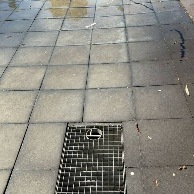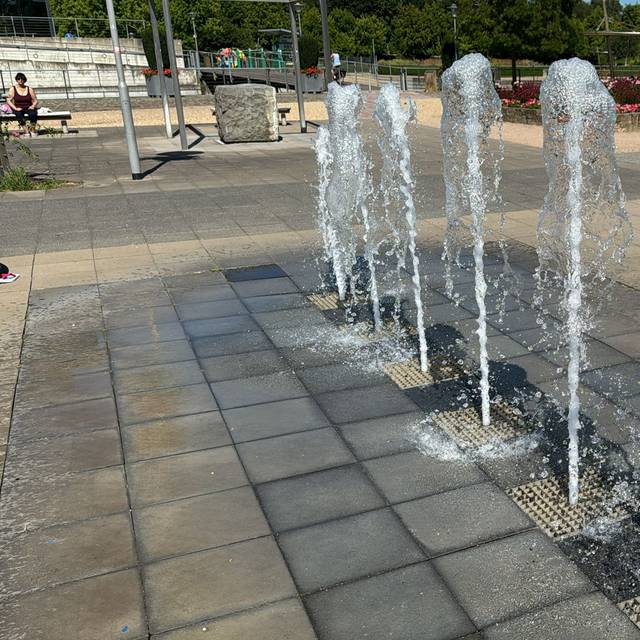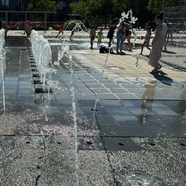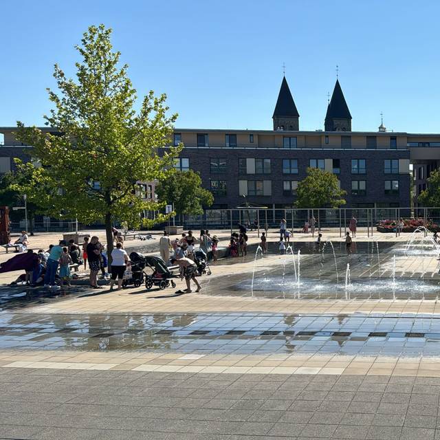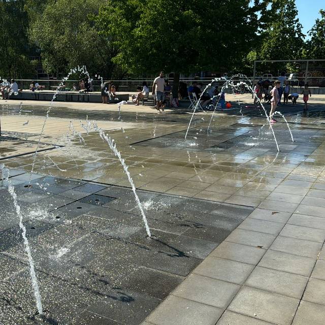 Vor dem Rock n Pop Museum in Gronau ist der Inselpark. Verschiedene Wasserfontänen kommen auf dem Platz aus dem Boden herausgeschossen. Manche gehen gerade hoch und manche bilden einen Bogen, das wichtigste dabei ist aber die Abkühlung bei warmen Wetter, die vor allem Kinder genießen.