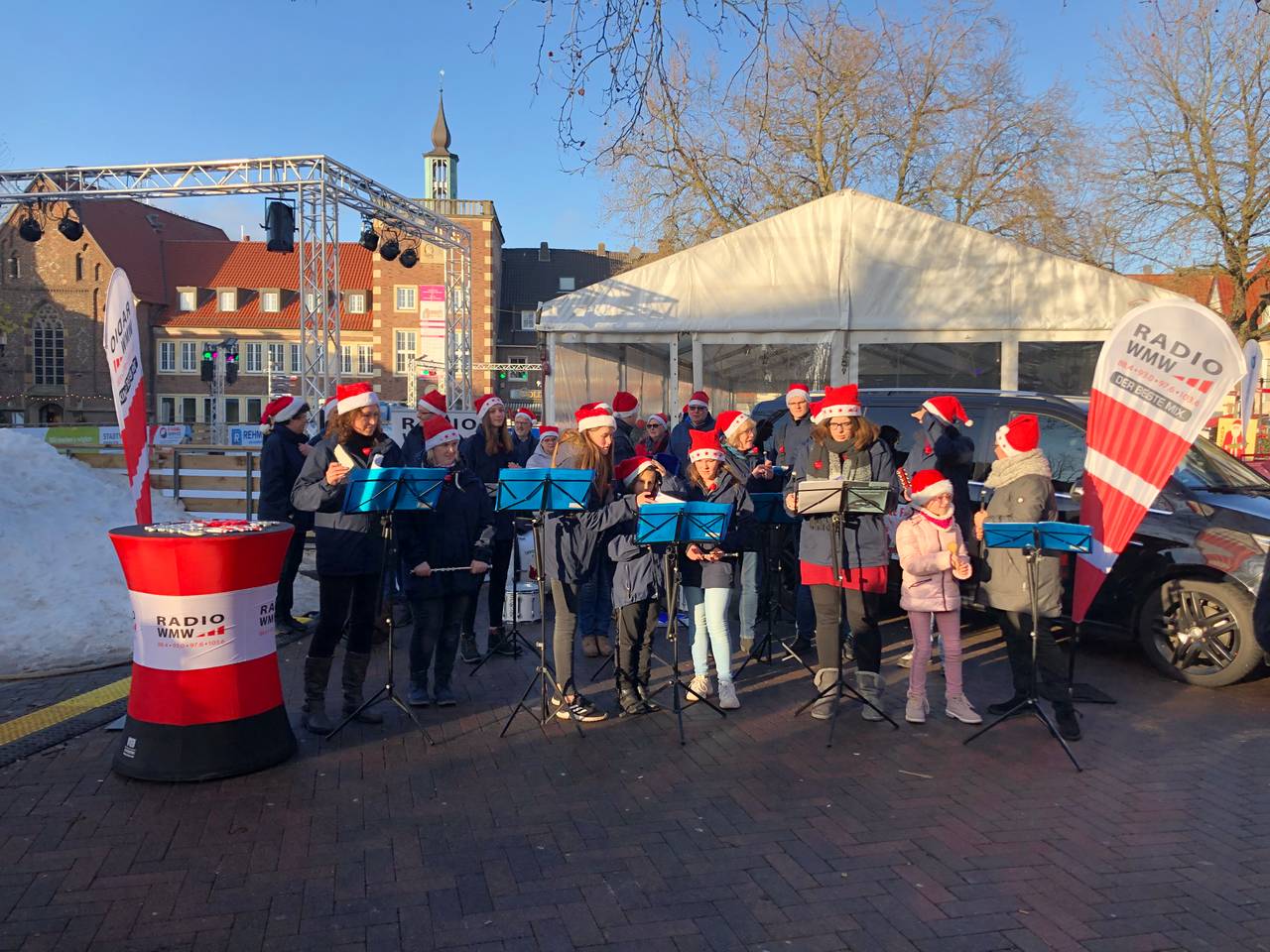Unsere Morningshowmoderatoren Daniel Krawinkel und Silvia Ochlast haben gewettet, dass der Spielmannszug Borken es NICHT schafft, um 15 Uhr mit mindestens 15 Menschen 15 Minuten lang ein kleines Weihnachtskonzert zu spielen.