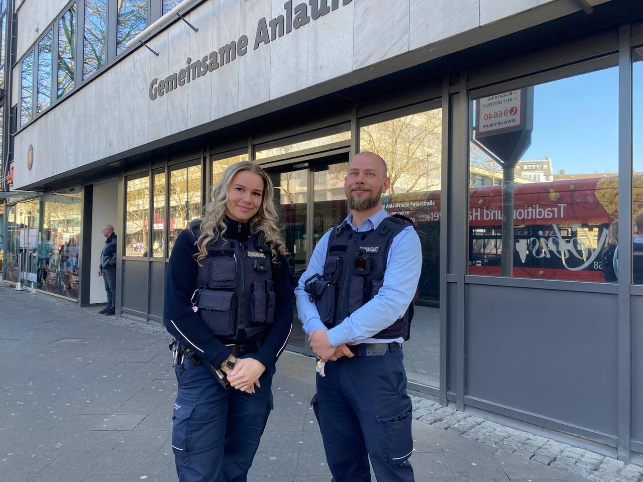 Lena Lennartz und Gerrit Voigtsberger sind für das Ordnungsamt in Aachen angestellt. Seit einem halben Jahr sind sie zu ihrem Schutz auch mit Bodycams ausgestattet.© Kimberly Kahle