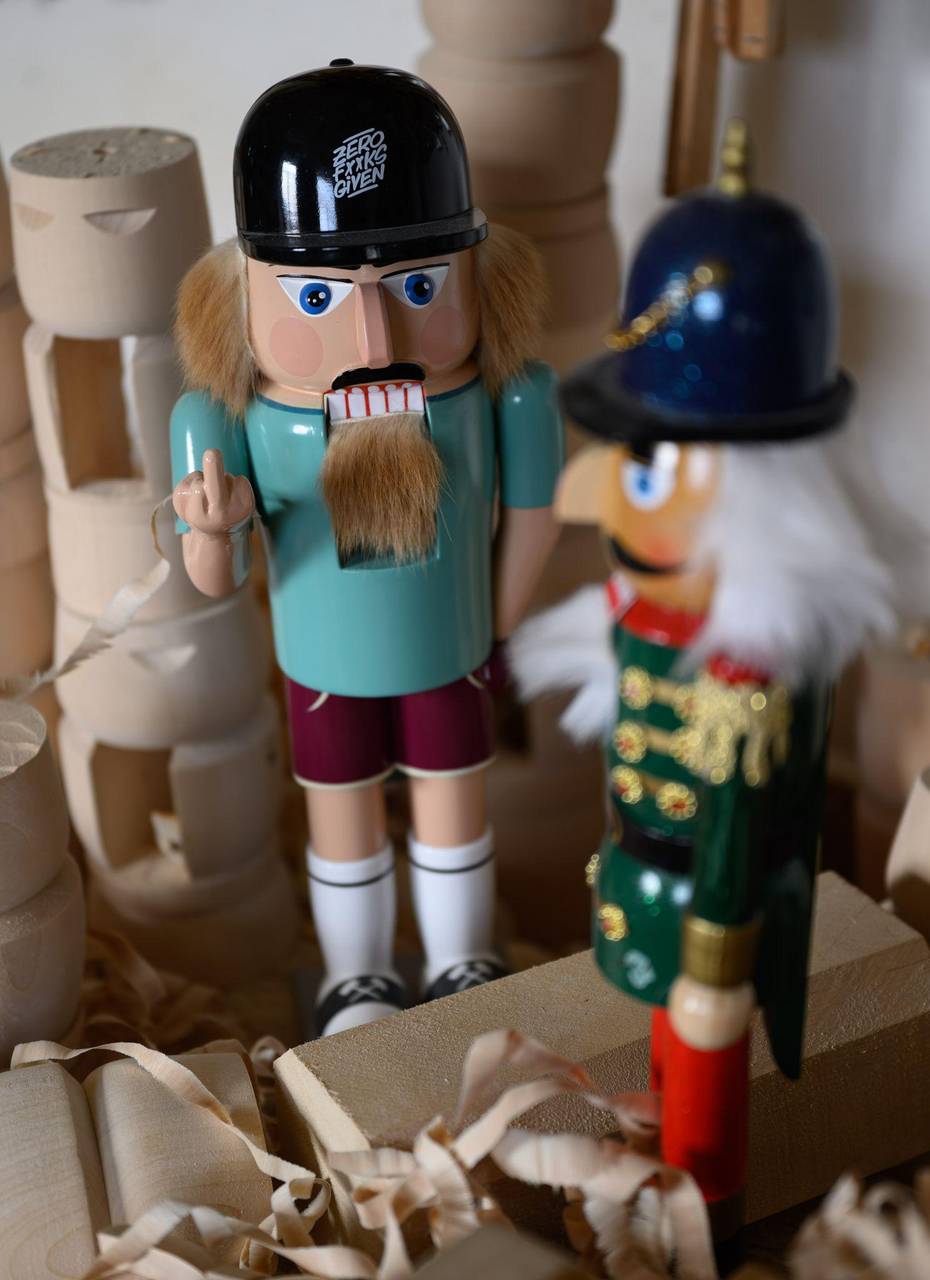 Auf den erzgebirgischen Nussknacker lässt Füchtner nichts kommen, gilt doch sein Ur-Ur-Ur-Großvater als dessen Erfinder. Also hat er an der Drechselbank das gemacht, was er besonders gut kann: einen neuen Nussknacker. Der ist zwar wie seine Kollegen aus Holz und hat Bart und Haar aus Kaninchenfell. Statt rotem Gewand trägt er jedoch kurze Hosen und Basecap. Und die Hand zeigt eine eindeutige Geste. Der hölzerne Rebell sei in Zusammenarbeit mit «Boys from the Wood» entstanden - einer Gruppe junger Leute, die das Erzgebirge und sein Brauchtum auf moderne Art und Weise feiern, betont der 44-Jährige.