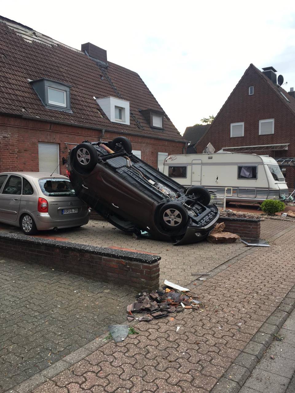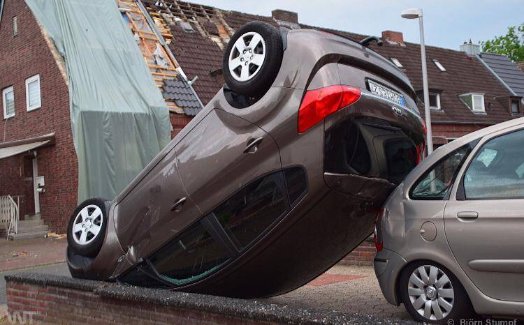 Ein Bild der Verwüstung zeigt sich in Bocholt: dort zog eine Windhose durch den Bereich Heroldstraße, Kurfürstenstraße und Markgrafenstraße. Dabei wurden sechs Häuser sowie ein Auto und ein Wohnwagen beschädigt. Die Höhe des Schadens ist noch nicht bekannt. Die Aufräumarbeiten laufen.