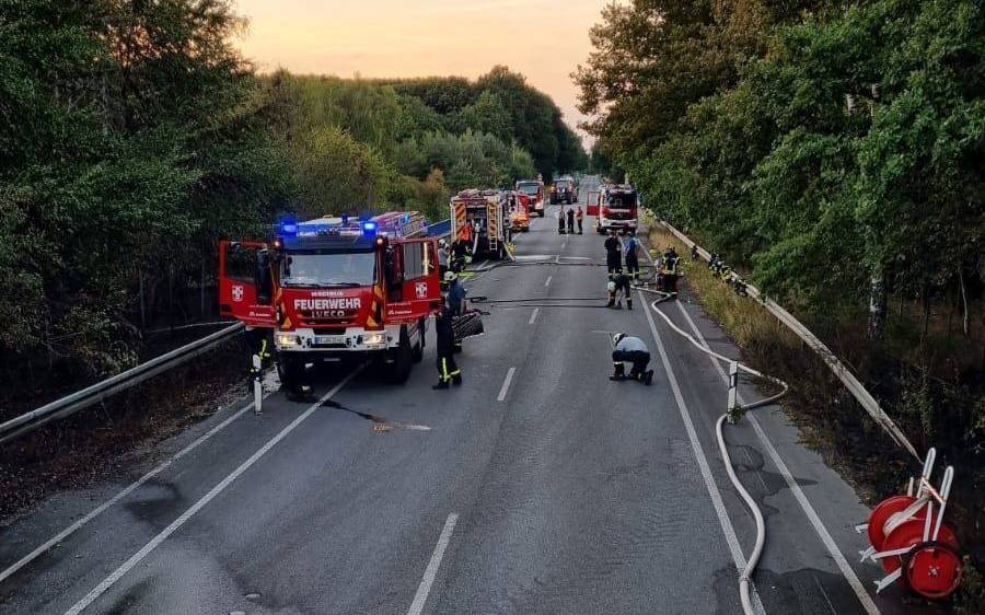 Bei Schermbeck brennt eine Fläche von rund 20.000 Quadratmetern. Es handelt sich vor allem um ein Heidegebiet. Rund 100 bis 120 Feuerwehrleute sind im Einsatz, darunter auch welche aus Heiden und Erle. Ob sich das Feuer weiter ausbreitet oder eingedämmt werden kann, lässt sich aktuell schwer sagen und hängt auch vom Wind ab. Durch die starke Rauchentwicklung kommt es in dem Bereich auf der A31, der B224 und der B58 zu starken Behinderungen. Am besten ihr umfahrt den Bereich großräumig.