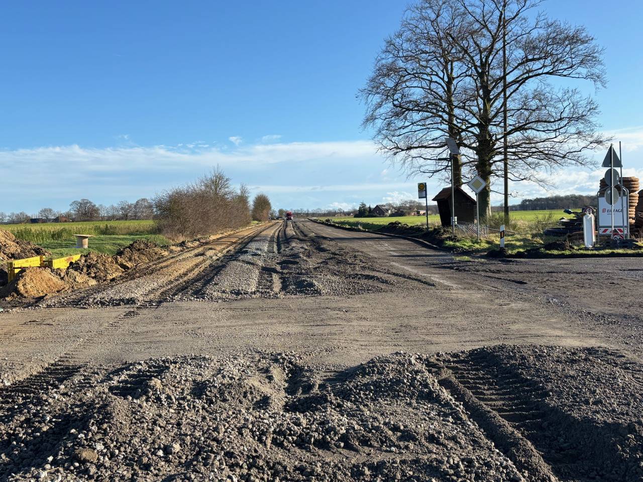 Aktuell gleicht der Abschnitt zwischen Rhede und Vardingholt einer Schotterpiste. Denn im Rahmen der Sanierung wird der alte Straßenbelag abgetragen und mit Lastwagen abtransportiert.