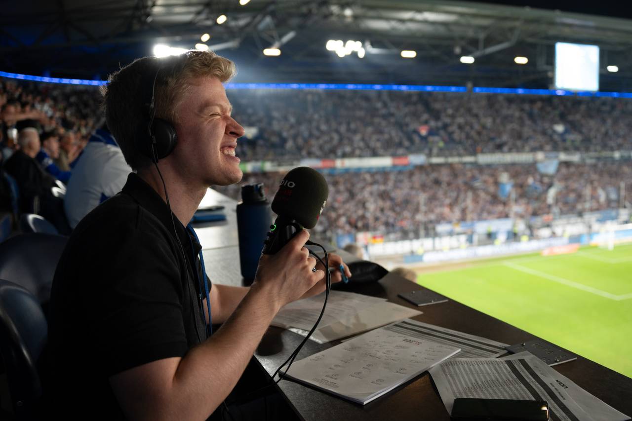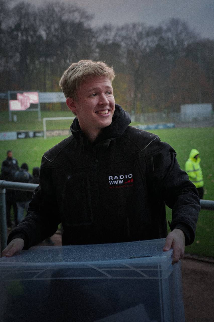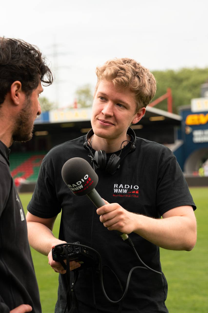 Robin Niehaus als Sport-Reporter für Radio WMW im Stadion am Hünting